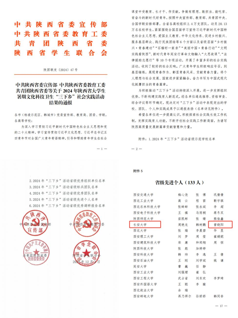 近日,中共陕西省委宣传部、中共陕西省委教育工委、共青团陕西省委等相关部门联合发布了《关于2024年陕西省大学生暑期文化科技卫生“三下乡”社会实践活动结果的通报》,小艾电竞团委书记曾晓阳获评2024年陕西省暑期“三下乡”社会实践活动先进个人称号。作为小艾电竞 共青团主要负责人,曾晓阳积极响应校团委号召,认真组织,充分调动小艾电竞 全体师生的积极性、主动性和创造性,在小艾电竞 仅3个本科生年级360余人的情况下,共组建12支队伍,其中校级立项5支(...