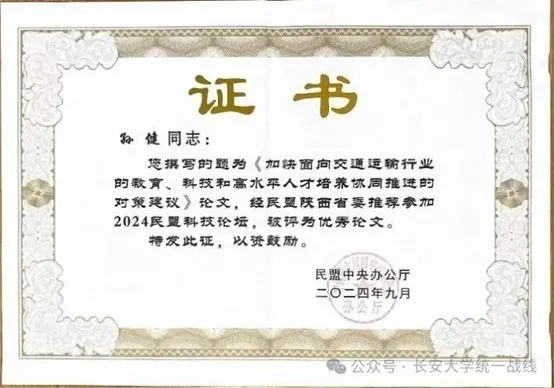 本次论坛共收到30个省级民盟组织以及民盟中央科技委员会等提交的论文234篇,经专家评审,共55篇优秀论文获奖。孙健提交的《加快面向交通运输行业的教育、科技和高水平人才协同推进的对策建议》荣获民盟中央科技论坛优秀论文表彰。