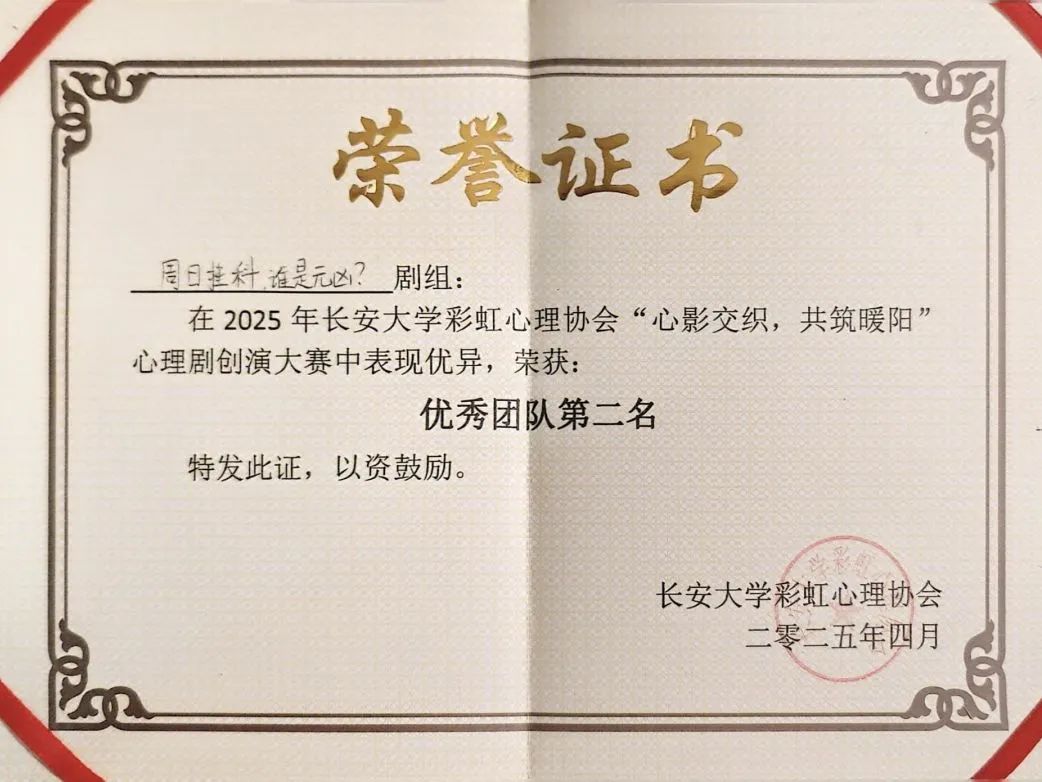 凭借《周日挂科,谁是元凶》剧目斩获本届心理剧创演大赛二等奖(第二名)、“最佳导演奖”(袁馨婷)、“最佳演员奖”(杨佳祥)三项殊荣,为参赛队伍中获奖数量最多队伍,实现学院心理育人工作新突破。