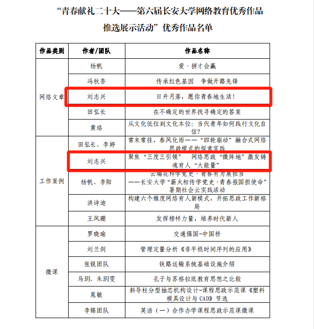 ”(原“长大工科试验班”)荣获“优秀校园新媒体团队建设奖”,院学生事务部副主任刘志兴网络文章《日升月落,愿你青春地生活!》、工作案例《聚焦“三度三引领”网络思政“微阵地”激发铸魂育人“大能量”》荣获“网络教育优秀作品”,学院2020级本科生符竹子创作网文《生而逢盛世,青年当有为》荣获“网络文化节”作品三等奖。