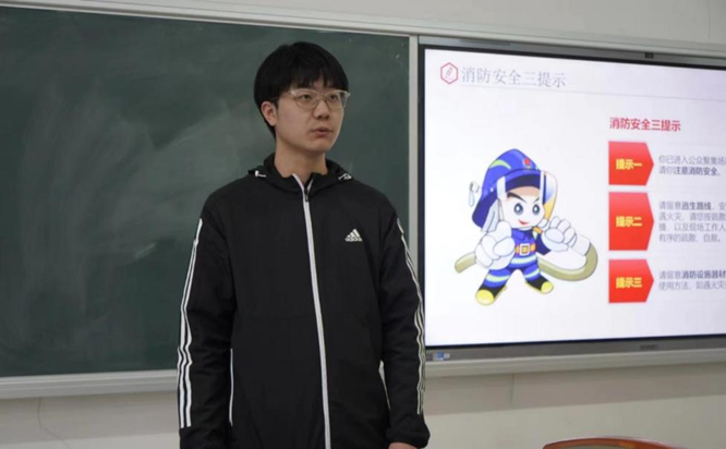 赵何伟从警示、防火和逃生三个方面对消防安全知识进行讲解。他向同学们介绍了火灾中造成人员伤亡的几个主要因素,并着重讲解了逃生时行为失当造成的严重后果,提醒同学们要加强对消防安全知识的学习,掌握正确的逃生方法。就宿舍防火,赵何伟展示了在宿舍拍摄的有火灾隐患的图片,表示用电不规范是造成宿舍起火的主要因素,同时他列举出一些大功率违规电器,提醒禁止在宿舍使用大功率违规电器。
