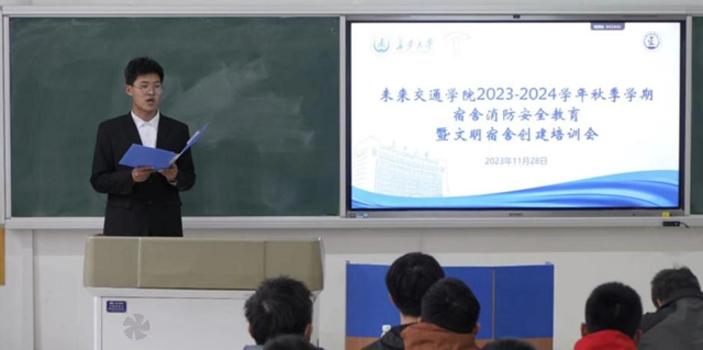 于WH2102举办2023-2024学年秋季学期宿舍消防安全教育暨文明宿舍创建培训会,院学生会主席团成员赵何伟受邀担任主讲嘉宾,院团委书记曾晓阳出席活动,2022级、2023级全体宿舍长参会。会议由院学生会权益服务部志愿者张泰齐主持。