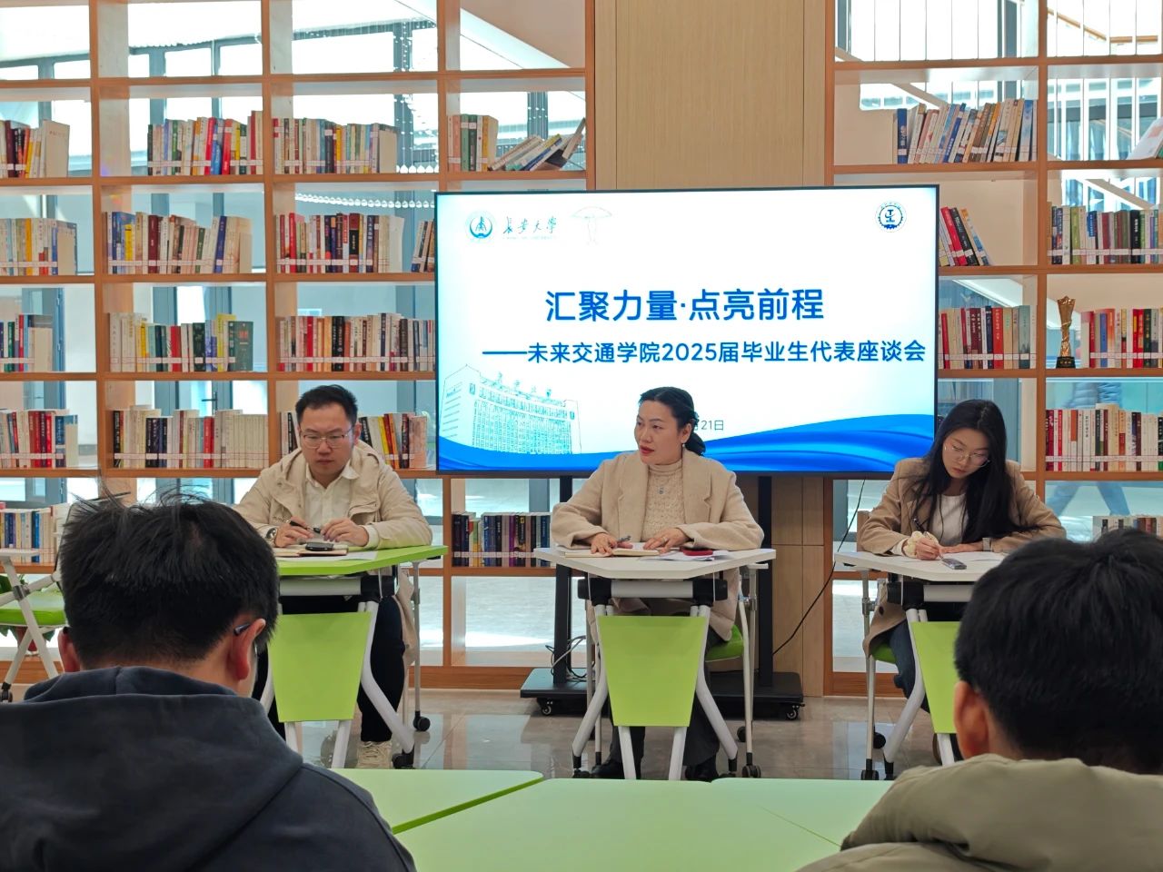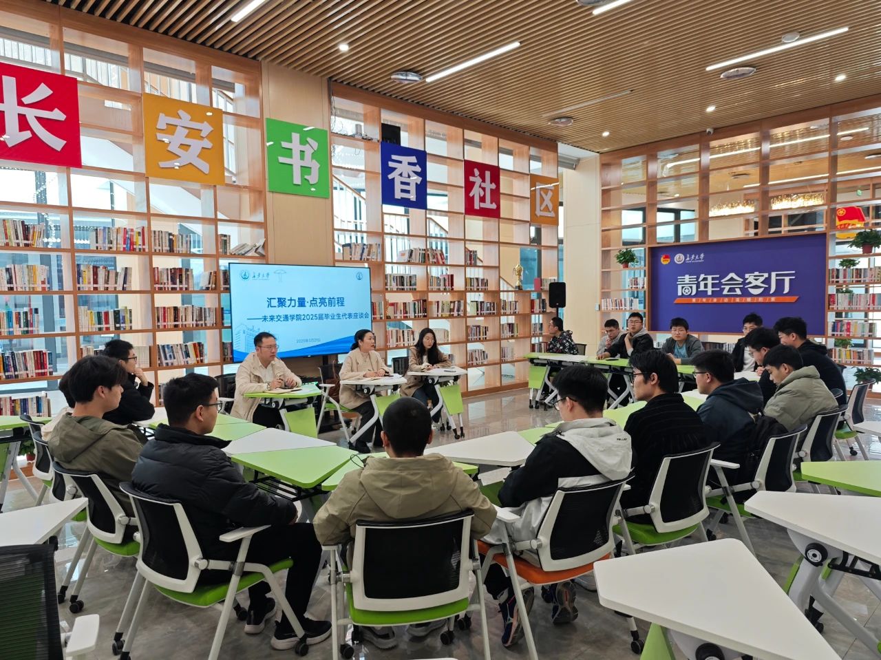 在鸿渐园青年会客厅召开“汇聚力量·点亮前程”2025届毕业生代表座谈会。学院副院长汤颖颖、学生事务部主任刘志兴、毕业年级辅导员范荣欣出席会议,20余名毕业生代表参加。会议由范荣欣主持。