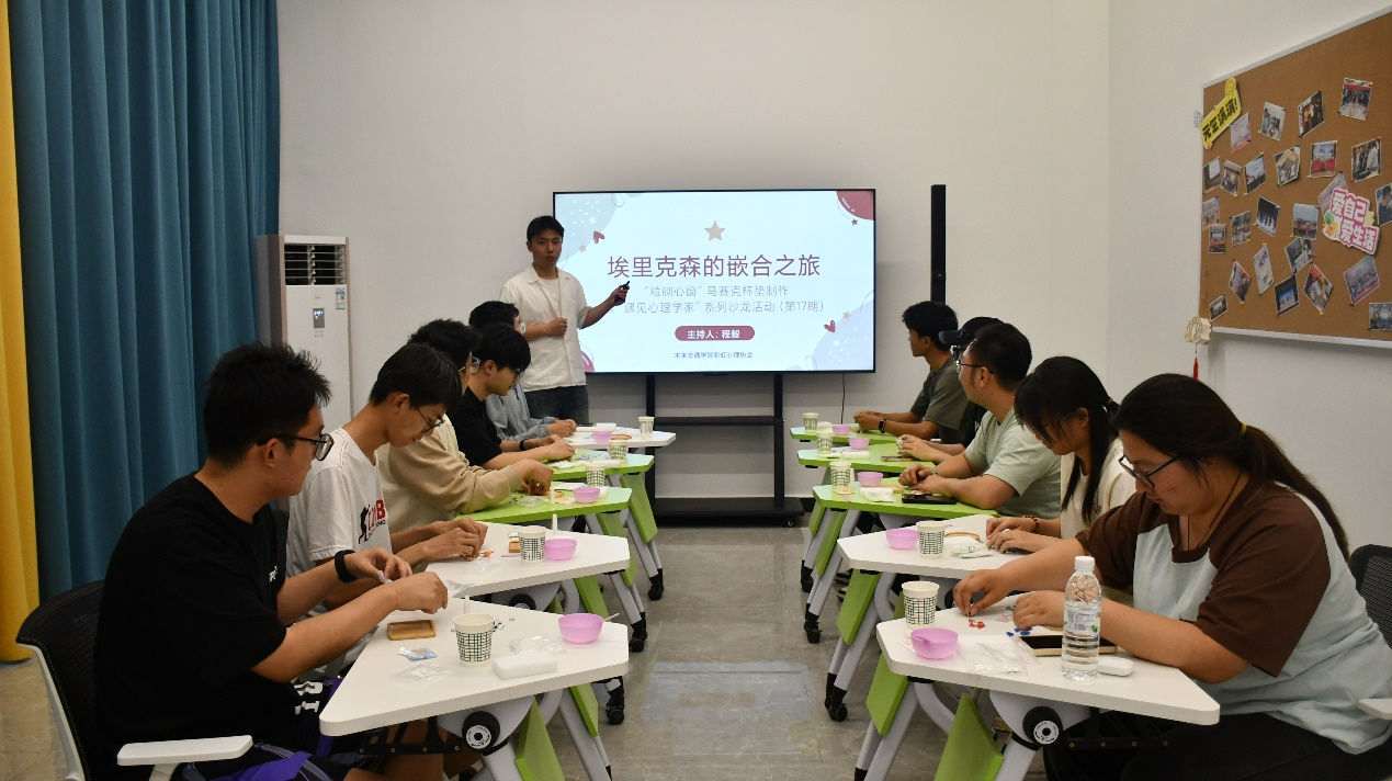 程毅带领大家走进埃里克森的精神世界。作为著名发展心理学家,埃里克森提出的社会心理发展理论将人的一生划分为八个阶段,每个阶段都面临着特定的心理冲突。从婴儿期的信任与不信任,到成年晚期的完善与绝望,埃里克森强调社会环境对个体发展的重要影响。本期活动巧妙地将这一理论融入马赛克杯垫制作中,引导同学们思考自身成长的独特性——正如每一片马赛克都承载着不同的色彩与故事,每个人的成长历程也是由不同阶段的经历拼贴而成。