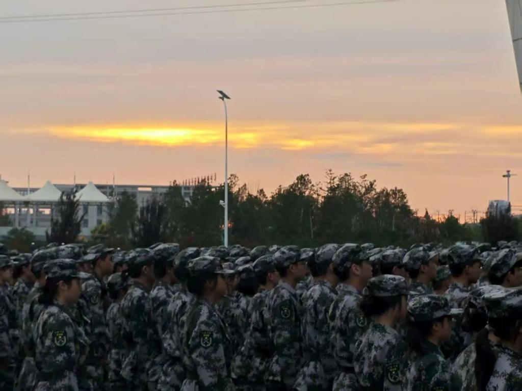 哨声划破晨光,军训拉开帷幕。“立正!”口令铿锵有力,回荡在操场。同学们迅速列队,双脚六十度分开,膝盖绷紧,双腿如同钉入地面,收腹挺胸,腰杆如尺。青春身姿挺拔如初阳,训练征程自此启航,热血悄然点燃。