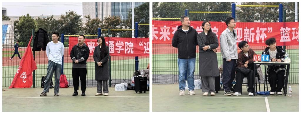 2025年“迎新杯”篮球赛决赛在北校区鸿翔体育场拉开帷幕。院学生事务部主任刘志兴,院团委书记曾晓阳以及新生辅导员范荣欣来到现场观赛。